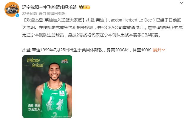 欢迎杰登·莱迪加入辽篮大家庭!期待他迅速融入球队,与队友们并肩作战,为辽宁球迷奉献更多精彩比赛,共同向着更高的目标发起冲击!