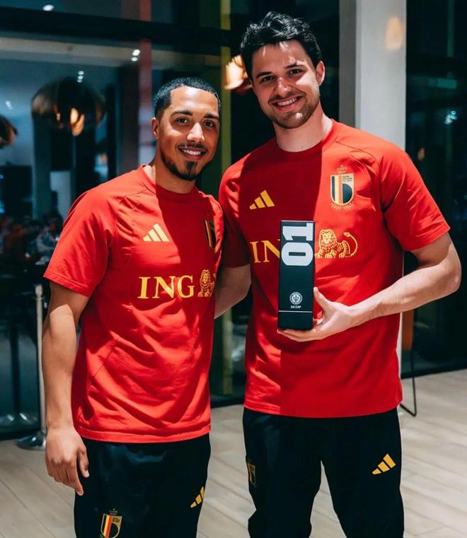比利时国家队队长蒂莱曼斯为拉门斯颁发他的首秀纪念奖杯