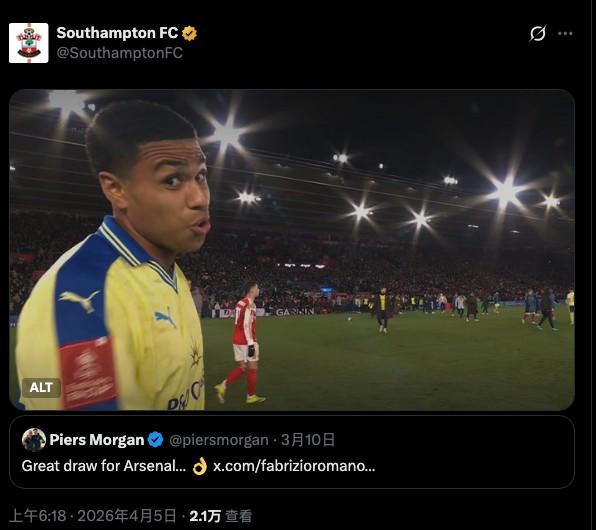 抽签后摩根曾说阿森纳抽到好签,被南安普顿官方“挖坟”